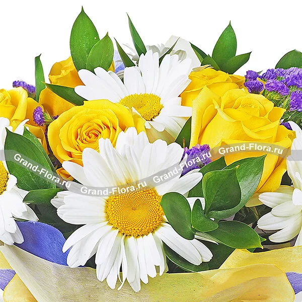 ЛЮКС: ромашка белая - 11 шт, роза желтая - 10 шт, статица - 5 шт, рускус, фетр желтый, бант фиолетовый.