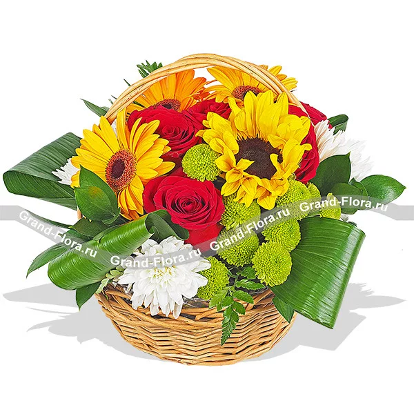 Уменьшенный: роза красная - 3 шт, гербера желтая - 1 шт,  подсолнух - 1 шт, хризантема кустовая зеленая - 1 шт, хризантема кустовая белая - 1 шт,  лист аспидистры - 3 шт, рускус, оазис, корзина.