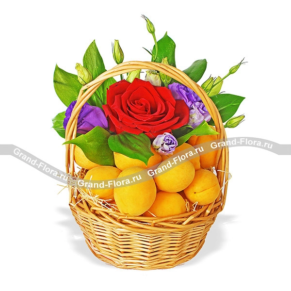 Стандартный: роза красная - 1 шт., эустома фиолетовая - 2 шт., рускус - 2 шт., оазис, корзина малая, абрикоса - 1,5 кг.