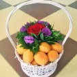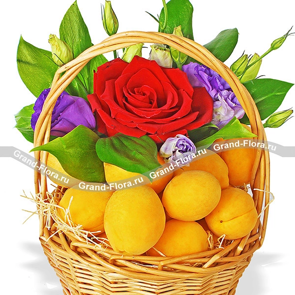 Уменьшенный: (На фото) роза красная - 1 шт., эустома фиолетовая - 1 шт., рускус - 1 шт., оазис, корзина малая, абрикоса - 1 кг.