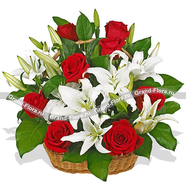 Стандартный (на фото): роза красная (50 см) - 9 шт., лилия белая - 2 шт., рускус, оазис, корзина.