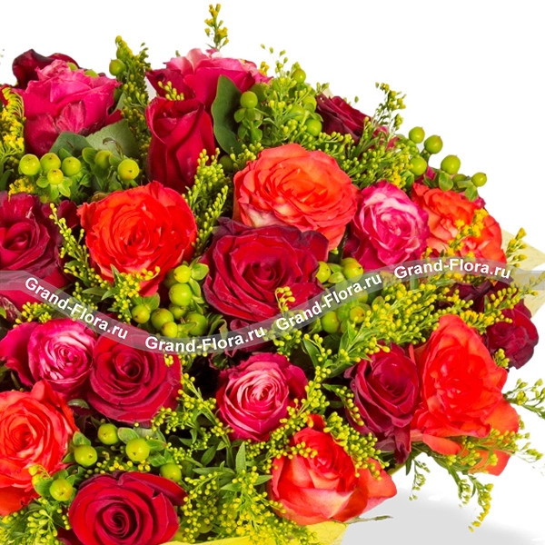 21 роза: роза красная - 8 шт., роза оранжевая - 7 шт., роза розовая - 6 шт., солидаго, гиперикум, фетр желтый, бант красный.