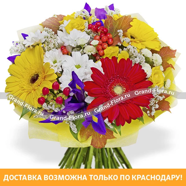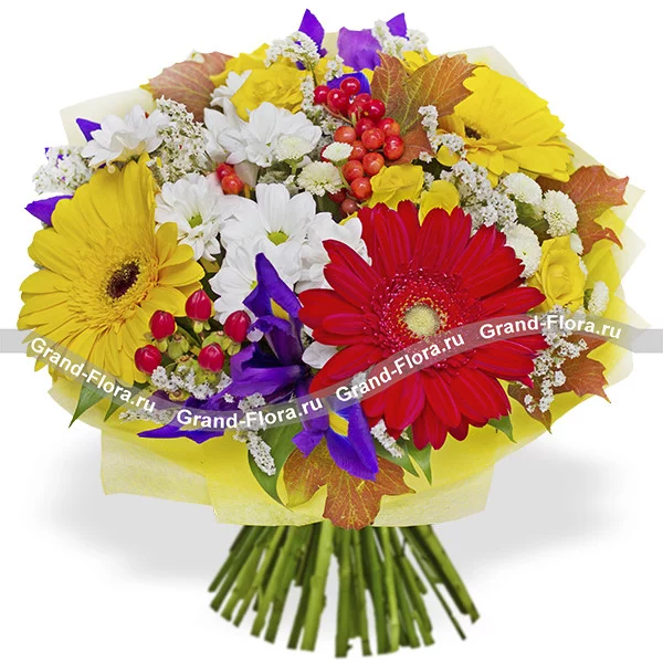 Стандартный: гербера желтая - 2 шт., гербера красная - 1 шт., роза кустовая желтая - 2 шт., хризантема кустовая ромашковая белая - 1 шт., ирисы синие- 3 шт., хризантема кустовая белая сантини - 2 шт., гиперикум - 2 шт., статица белая, декоративная зелень и листья, упаковка фетр, лента.
