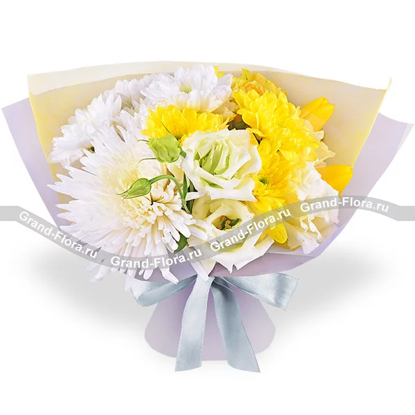 Стандартный: хризантема одноголовая белая - 1 шт., хризантема кустовая белая - 1 шт., кустовая роза желтая - 3 шт., хризантема кустовая желтая - 2 шт., тюльпан желтый - 6 шт., эустома белая - 2 шт., упаковка, лента. Примерный размер: 35Х35 см.