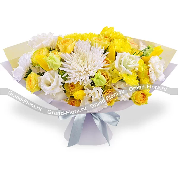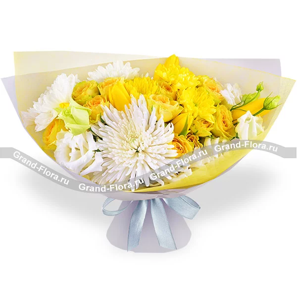 Букет выполнен из кустовых роз желтого оттенка, шикарной белой хризантемы, солнечных кустовых хризантем, игриво разбросанных мазками по всей композиции и желтых тюльпанов. Воздушности букету придает белая эустома, создавая иллюзию белых облачков, уютно покачивающихся в лучах теплого солнца.  Высота букета от 30 см, диаметр букета от 25см до 40 см, в зависимости от выбранного Вами варианта букета. Обращаем Ваше внимание, что состав и оформление букета могут отличаться.