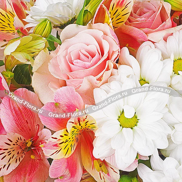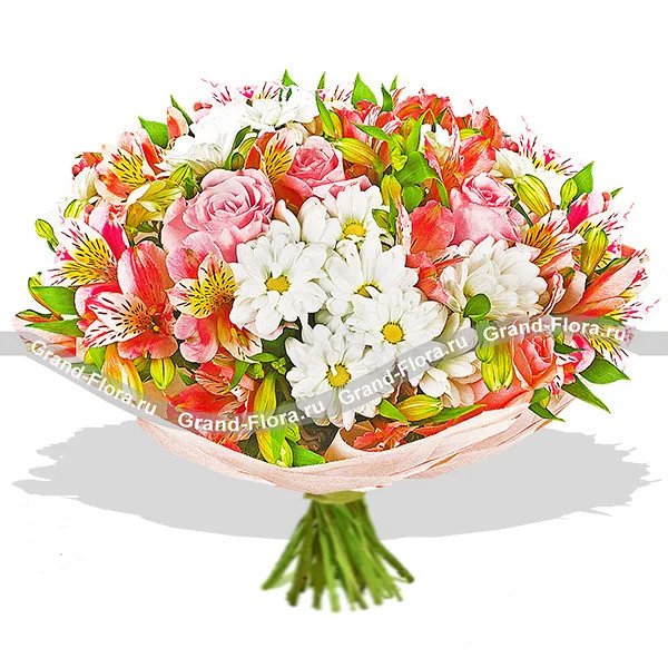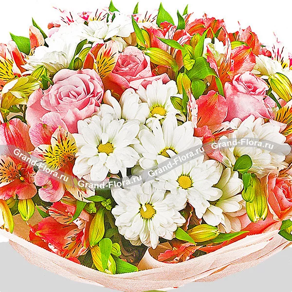 Светлый букет, собранный из ромашковых кустовых хризантем, розовых альстромерий и роз, наверняка пленит получателя своей наивной простотой, но в то же время и очаровательной красотой. Деликатное сочетание цветов, подчеркнутое оберткой из фетра и декоративным бантом, станет великолепным выбором для вручения маме или бабушке в памятный день.